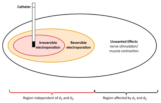 In addition to pulse waveforms, one also needs to consider the spatial distributions of electric fields in the context of the different thresholds involved in irreversible electroporation, reversible electroporation and/or nerve–muscle stimulation/activation. While keeping the same pulse parameters, the highest electric field is required for inducing cell death, followed by reversible electroporation, and muscle and nerve stimulation. This also means that the area of ablation by irreversible electroporation will be the smallest, surrounded by reversible electroporation, and affecting/stimulating the nerves passing through the surrounding zone (Figure 10). It is important to note that the spatial distribution of the electric field depends on the biophysical properties of the cardiac tissue, including the inhomogeneity and anisotropy of electric (i.e., conductivity and dielectricity) attributes, as well as on the electrode’s shape, i.e., the catheter design, and whether the pulses are delivered in a unipolar or bipolar fashion [57,58].