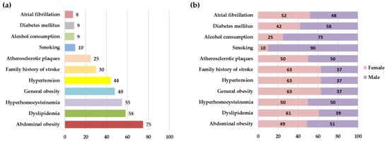 Prevalence of risk factors (%) in the entire study population (a) and depending on subject’s sex (b).