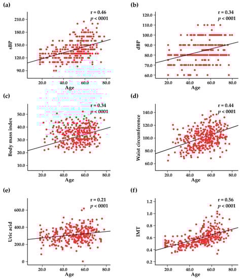 Scatter plots representing the correlations between age and systolic blood pressure (sBP) (a), diastolic blood pressure (dBP) (b), body mass index (c), waist circumference (d), blood uric acid levels (e), and intima–media thickness (IMT) (f).