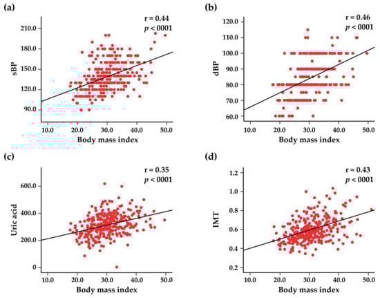 Scatter plots representing the correlations between the body mass index and systolic blood pressure (sBP) (a), diastolic blood pressure (dBP) (b), blood uric acid levels (c), and intima–media thickness (IMT) (d).