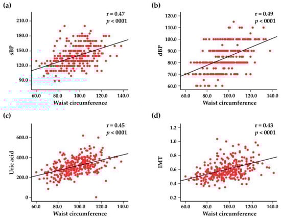 Scatter plots representing the correlations between waist circumference and systolic blood pressure (sBP) (a), diastolic blood pressure (dBP) (b), blood uric acid levels (c), and intima–media thickness (IMT) (d).