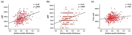 Scatter plots representing the correlations between intima–media thickness and systolic blood pressure (sBP) (a), diastolic blood pressure (dBP) (b), and blood uric acid levels (c).