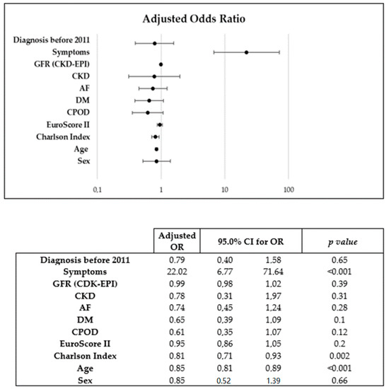 A multivariate binary logistic regression analysis, with backward stepwise selection method, was performed to detect those that were independently associated with the AVR indication. The following variables were introduced: age, sex, diagnosis before 2011, Charlson index, EuroScore II index, COPD, DM, CKD, eGFR, AF and symptoms. We included the date of diagnosis prior to 2011 as a variable because TAVR was implanted in our center that year. For model building, we selected variables with significant statistical association or those that showed a trend (p < 0.10) with respect to AVR indication. We use the likelihood ratio to determine the significance of each model.