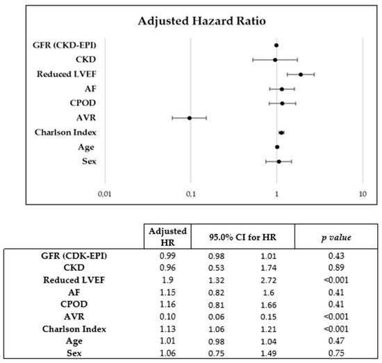 The survival-free rates of cardiovascular and all-cause mortalities at follow-up were estimated using the Kaplan–Meier survival curves and comparison between groups (gender and type of the treatment) with the log-rank test (Mantel–Cox). To identify the independent predictors of cardiovascular mortality, potential predictors’ variables with a p < 0.10 in the univariant analysis were included in the analysis (sex, age, Charlson index, AVR, reduced LVEF, AF, COPD, CKD and eGFR), which were incorporated with a stepwise selection procedure into a multivariable Cox regression proportional hazards model. Values of p < 0.05 were considered statistically significant. Statistical analyses were performed using SPSS version 18.0 software (IBM, Armonk, NY, USA) and MedCalc® Statistical Software version 20.014 (MedCalc Software Ltd., Ostend, Belgium, 2021).