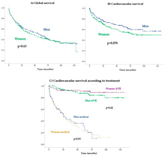 During a mean follow-up of 2.4 (4.78) years, 254 patients died, of which 54.2% were women. A Kaplan–Meier mortality analysis did not reveal a significant association between sexes in all-cause (Log-Rank p = 0.63) (Figure 3A) or cardiovascular (Log-Rank p = 0.07) (Figure 3B) mortality. Sex was not found to be associated with cardiovascular mortality in the Cox multivariate analysis (HR: 1.06 [0.75–1.49]; p = 0.748) in which the following mortality predictors were detected: AVR (HR 0.1 [0.06–0.15]), Charlson index (HR 1.13 [1.06–1.21]) and reduced LVEF (HR 1.9 [1.32–2.73]) (Figure 2).