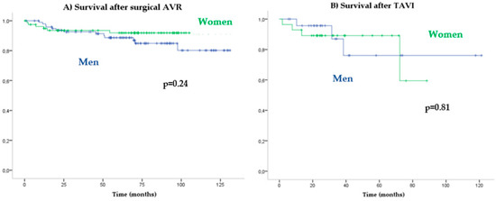 Patients with AVR had higher survival rates than with medical treatment (HR: 0.08 [0.05–0.13]; p < 0.001). No significant differences in cardiovascular mortality were observed between the genders in the function of the treatment received: conservative treatment (log-rank p = 0.93) versus AVR (log-rank p = 0.42) (Figure 3C). Long-term prognosis after surgical AVR (log-rank p = 0.24) (Figure 4A) versus TAVR (log-rank p = 0.81) also did not differ significantly between women and men (Figure 4B).