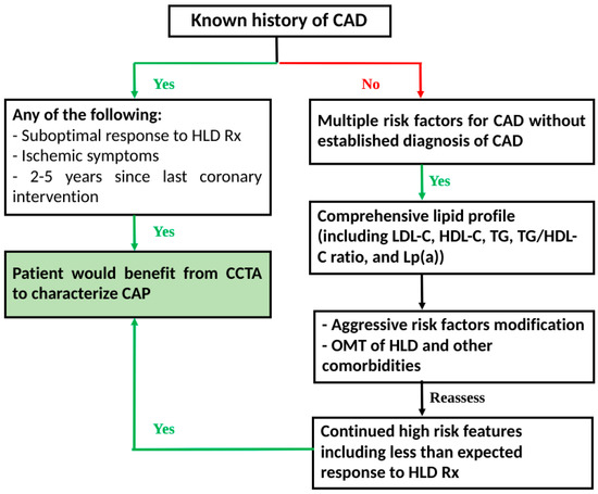 CCTA can help diagnose HRP early and be a guide for a more effective therapy for HLD. When appropriately utilized, CCTA can be crucial in detecting, treating, and assessing future ACS risk, especially among groups at high-risk of CAD. In Figure 1, we have outlined a flowchart that can serve as a roadmap for the optimal utilization of CCTA and laboratory testing. We believe that in the current era of CAD and HLD management, the earlier utilization of modern imaging modalities, with the help of CCTA, in conjunction with a more updated approach to measuring cholesterol levels, can help diagnose CAD in the early stages. It can also be a guide in the titration of medication to achieve optimal control. In addition, such a pathway can reduce CAD morbidity and mortality while potentially providing substantial future benefits such as reducing healthcare costs and the utilization burden.