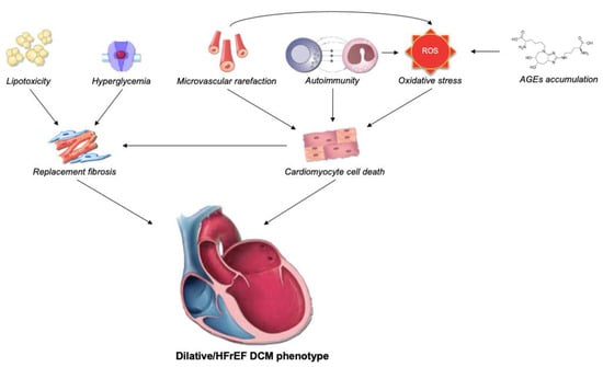 Pathophysiological mechanisms underlying the “dilative” diabetic cardiomyopathy phenotype. Complex interaction of hyperglycemia, lipotoxicity, oxidative stress, autoimmune cell destruction, hypoxia, and AGE deposition leads to cardiomyocyte cell death and replacement fibrosis, with end-result being reduced contractile force and clinical syndrome of HFrEF. Abbreviations: AGEs: advanced glycation end products; DCM: diabetic cardiomyopathy; HFrEF: heart failure with reduced ejection fraction; ROS: reactive oxygen species.