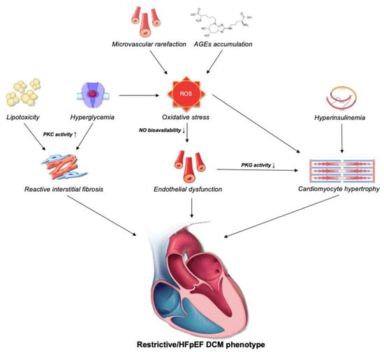 Pathophysiological mechanisms underlying the “restrictive” DCM phenotype. Hyperglycemia, lipotoxicity, AGE accumulation, and microvascular rarefaction all contribute to the development of endothelial dysfunction. Subsequently, lack of NO bioavailability leads to myocardial hypertrophy by down-regulation of PKG activity, which is further supported by hyperinsulinemia. Finally, pathological hypertrophy dampens diastolic function of the myocardium. On the other hand, hyperglycemia and lipotoxicity increase PKC activity, thus leading to reactive interstitial fibrosis that further dampens diastolic function and contributes to the development of HFpEF. Abbreviations: AGEs: advanced glycation endproducts; DCM: diabetic cardiomyopathy; HFpEF: heart failure with preserved ejection fraction; PKG: protein kinase G; PKC: protein kinase C; ROS: reactive oxygen species.