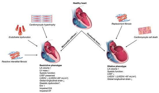 - Seferović, P.M.; Paulus, W.J. Clinical diabetic cardiomyopathy: A two-faced disease with restrictive and dilated phenotypes. Eur. Heart J. 2015, 36, 1718–1727. [Google Scholar] [CrossRef] [PubMed]