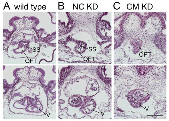 Ets1 knockdown in the cardiogenic mesoderm leads to HLHS-like phenotype in the frog. Transverse sections through (A) wildtype, (B) neural crest knockdown, and (C) cardiac mesoderm knockdown embryos are shown. Ets1 knockdown in the neural crest cells results in outflow tract defects but does not affect ventricular development significantly. In contrast, Ets1 knockdown in the cardiac mesoderm results in an underdeveloped ventricle with reduced chamber volume, mimicking the HLHS phenotype. SS, siral septum; OFT, outflow tract; V, ventricle. Scale bar = 200 um. (Reproduced with permission from [56].).
