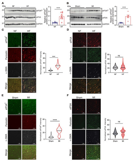 Induced eIF5AH protein expression is associated with human and mouse heart failure. (A) eIF5AH protein was increased in failing human hearts (n = 10) compared to non-failing donor hearts (n = 10). GAPDH was used as a loading control for quantification. (B) eIF5AH protein was increased in mouse MI hearts (n = 6) compared to sham hearts (n = 6). Quantification of Western blot results from the border zone of the MI heart and the corresponding region of the sham heart was performed. GAPDH was used as a loading control for quantification. (C,D) eIF5AH protein was increased in the cardiac fibroblasts of failing human hearts compared to non-failing donor hearts. n = 120 cells were counted from multiple sections from mouse hearts (n = 10). Scale bar: 10 μM. Co-staining of Postn and α-SMA was performed. (E,F) eIF5AH protein was increased in the cardiac fibroblasts of mouse MI hearts (n = 6) compared to sham hearts (n = 6). Scale bar: 10 μM. *** p < 0.001, **** p < 0.0001, ns: not significant by unpaired two-tailed student t test.