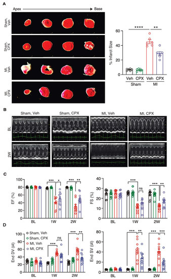 eIF5A is essential for translating Pro-rich proteins [6,7,8,9], which include many extracellular matrix proteins such as collagens. To test whether inhibition of eIF5A activity reduces cardiac fibrosis, we treated the MI mouse model with a deoxyhypusine hydroxylase inhibitor CPX after the MI surgery (4 h post-MI) for 14 consecutive days (Figure 2A). We monitored the phenotypic improvement over the vehicle control treatment. We observed significantly reduced cardiac hypertrophy, as shown by the reduced ratio of heart weight to tibia length (HW/TL) and cardiomyocyte cell surface area (Figure 2B,C). The area of cardiac fibrosis was decreased by ~40% after CPX treatment (Figure 2D). Expressions of cardiac hypertrophy marker genes Myh7 and Myh6 were dysregulated upon MI surgery and partially restored by CPX treatment. Moreover, Col1a1, Col1a3, and Fn1 mRNA expression levels were induced during MI and significantly reduced by CPX (Figure 2E, Table 2). Immunostaining of myofibroblast activation marker proteins α-SMA and COL1A1 further confirmed reduced cardiac fibrosis at the protein level, as both proteins were drastically reduced by 66% and 39% upon CPX treatment following MI, respectively (Figure 2F). Consistently, the infarct size was reduced by 36% after CPX treatment following MI (Figure 3A). Echocardiography measurement showed that left ventricle ejection fraction and fractional shortening were partially recovered in CPX-treated mice compared to vehicle-treated mice after MI surgery (Figure 3B,C). In addition, left ventricle end diastolic and systolic volumes were reduced in CPX-treated mice (Figure 3C). Taken together, these results suggest that CPX prevents hearts from cardiomyocyte hypertrophy and cardiac fibrosis, and restores cardiac function after MI insult.