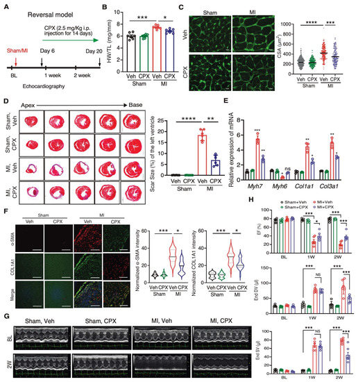 To examine the potential therapeutic benefit of CPX in ischemic heart disease, we tested a reversal model by starting CPX injection 6 days after MI surgery for 14 consecutive doses (Figure 4A). We found that cardiac hypertrophy was reduced by CPX treatment compared to vehicle treatment following MI surgery, as indicated by decreased HW/TL ratio and cell surface area of cardiomyocytes by 17% (Figure 4B,C). Intriguingly, the fibrosis area was reduced by 62%, indicated by Mason’s Trichrome staining (Figure 4D). The expression of cardiomyocyte hypertrophy markers Myh7 and Myh6 was partially reversed by CPX, while the expression of fibrosis markers Col1a1 and Col3a1 was reduced by ~50% (Figure 4E, Table 2). Consistently, myofibroblast marker protein COL1A1 and α-SMA levels were significantly decreased in the CPX treatment group (Figure 4F). Echocardiographic analysis showed that cardiac function was moderately enhanced, as indicated by increased ejection fraction and decreased left ventricle end diastolic and systolic volume upon CPX treatment, 20 days after initial MI surgery (Figure 4G,H). These results suggest that CPX antagonizes cardiac pathological remodeling and fibrosis in MI heart failure models.