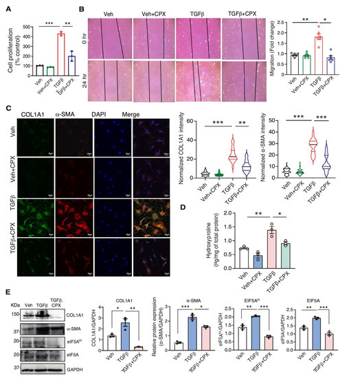 Because CPX inhibited cardiac fibrosis in the mouse MI model in vivo, we sought to test whether CPX directly acts on the cardiac fibroblast cells autonomously. We treated cultured primary mouse CFs with CPX following TGFβ stimulation, and examined the changes in cellular phenotypes. TGFβ induced cell proliferation by 4.2 folds, while CPX reduced the proliferation rate by 53% (Figure 5A). In a wound scratch assay, we observed that CPX significantly decreased TGFβ-induced cell migration of primary mouse CFs to the basal level (Figure 5B). In the cultured mouse CF cells, COL1A1 and α-SMA protein expression were drastically reduced by ~45% and ~60%, respectively, in CPX-treated cells with TGFβ stimulation compared to TGFβ-treated cells (Figure 5C, Table 1). The global cellular incorporation of hydroxyproline was reduced by 35%, indicating remarkably reduced total collagen synthesis (Figure 5D). Using Western blotting, we observed that expression of eIF5AH, COL1A1, and α-SMA was indeed significantly reduced in primary mouse CFs treated with CPX following TGFβ stimulation (Figure 5E, Table 1). Taken together, these data suggest that CPX directly inhibits the cellular activity of cardiac fibroblasts, prevents fibroblast-to-myofibroblast transition, and compromises the synthesis of collagen proteins.