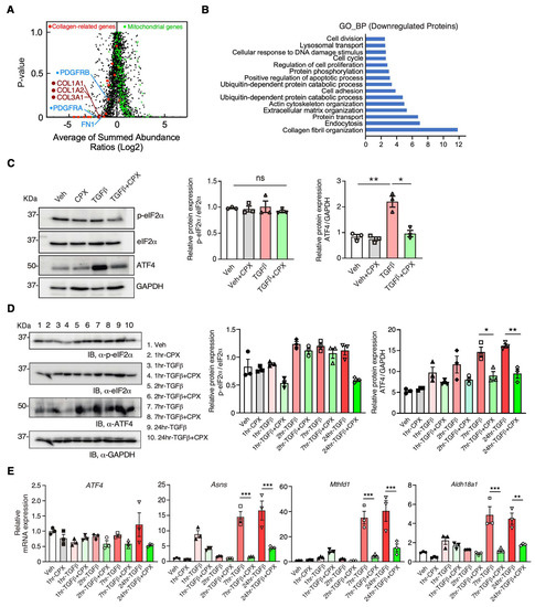 Proteomic reprogramming by ciclopirox in mouse cardiac fibroblasts. (A) Mass spectrometry analysis in 10 μM CPX-treated primary mouse CFs compared to vehicle-treated cells (24 h treatment). (B) Gene ontology analysis of downregulated proteins in primary mouse CFs by CPX treatment. (C) Western blot analysis of p-eIF2α, eIF2α, and ATF4 protein expression in NIH/3T3 cells. NIH/3T3 cells were treated with TGFβ (10 nM) concentration and CPX (10 μM) at 24 h. Quantification of WB was shown on the right panel. (D) Western blot analysis of p-eIF2α, eIF2α, and ATF4 protein expression in NIH/3T3 cells. NIH/3T3 cells were treated with TGFβ (10 nM) concentration and CPX (10 μM) at 1, 2, 7, and 24 h in a time course. Quantification of WB was shown on the right panel. (E) RT-qPCR quantification of ATF4 mRNA and ATF4 target gene expression. n = 3 of independent experiments. * p < 0.05, ** p < 0.01, *** p < 0.001, ns: not significant by Two-way ANOVA with Tukey’s multiple comparisons test.