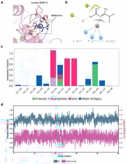 Matrix metalloproteinase-9 (MMP-9) is predicted to bind directly to metformin. (a) Predicted binding mode of metformin with MMP-9 (PDB id: 4wzv). (b,c) Protein–ligand contact histogram of metformin and the corresponding two-dimensional diagram predicted through MD simulations. A percentage value suggests that for X% of the simulation time, the specific interaction is maintained. (d) RMSD of the interaction between MMP-9 and the ligand metformin in MD simulations. MD, molecular dynamics; RMSD, root mean square deviation; MMP-9, matrix metalloproteinase-9.