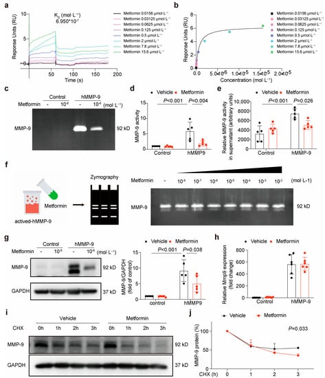 To verify whether metformin directly binds to MMP-9, we conducted surface plasmon resonance (SPR) experiments. The findings of the SPR-based assay suggested that the binding of metformin to MMP-9 occurred with a KD of 0.6950 μmol·L−1 (Figure 2a,b). To examine the ability of metformin to inhibit MMP-9 activity, we constructed an overexpression plasmid for human MMP-9 and transfected it, or a control plasmid into HEK293A cells using lipofectamine (Figure S1). Next, we incubated the transfected cells with metformin (1 μmol·L−1) for 24 h, and the MMP-9 activity in the cultured supernatant was detected using zymography and an MMP activity assay. Both results indicated that metformin incubation significantly attenuated the activity of MMP-9 (Figure 2c–e).