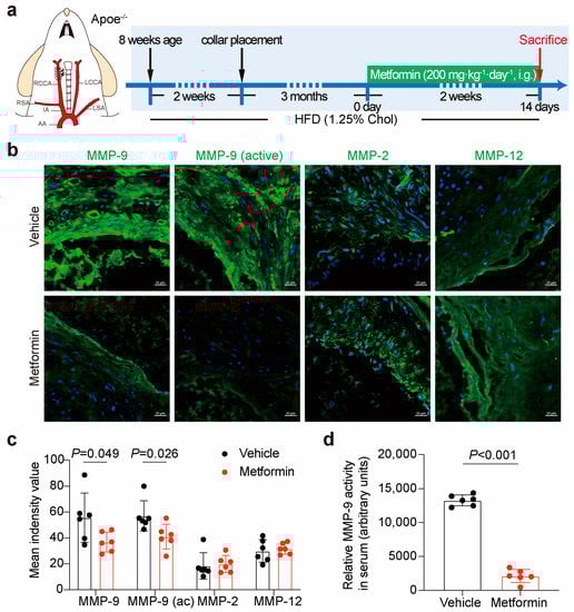 To further confirm whether metformin inhibits MMP-9 activity in vivo, we constructed a carotid artery plaque model in ApoE-/- mice (Figures S2 and S3) []. After a consecutive 14-day metformin treatment (200 mg·kg−1) by intragastric gavage (Figure 3a and Figure S4), we found that active MMP-9 and MMP-9 expression decreased in the plaque by immunofluorescence staining. However, metformin did not affect MMP-2/12 expression, which was reported to be related to plaque instability (Figure 3b,c). Moreover, the serum MMP-9 activity was detected using an MMP activity assay (Figure 3d). The results showed that metformin treatment inhibited local plaque and circulating MMP-9 activity.