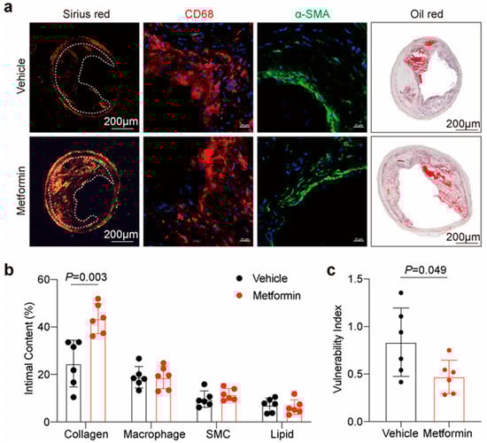 To determine the protective effects of metformin on atherosclerosis, we assessed the vulnerability index (VI) of the RCCA plaque using histology. The composition of plaques, including macrophages, collagen, lipids, and smooth muscle cells (SMCs) was demonstrated by CD-68, Sirius red staining, oil red O staining, and α-SMA immunostaining, respectively (Figure 4a,b). Sirius red staining results showed that the collagen content was preserved by the metformin treatment. Oil red O staining, α-SMA, and CD-68 immunofluorescence results suggested that there were no significant differences in lipid, SMCs, and macrophage content after metformin treatment. As each feature alone is insufficient for identifying high-risk plaques, the ratio between stable and unstable plaque components is often used to calculate the VI (macrophage content + lipid core content)/(SMC content + collagen content) in experimental studies []. The results showed that with the metformin treatment, plaque VI was significantly decreased, indicating that metformin had a beneficial effect on plaque stability (Figure 4c).