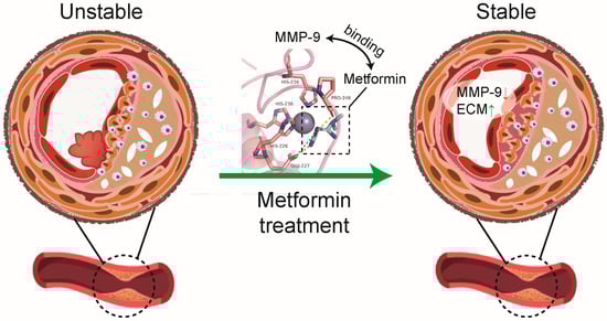 Vulnerable plaques are characterized by fragile, thin fibrous caps, massive lipid cores, intraplaque hemorrhage, immune activation, and increased levels of pro-inflammatory mediators (cytokines, chemokines, and matrix metalloproteinases) []. IL-6 stimulates the expression of adhesive molecules and results in an increase in the production and reactivity of acute phase indicators, such as C-reactive protein and TNF-α [,]. IL-18 and TNF-α are crucial for atherosclerotic plaque development and stability [,]. All of the cytokines mentioned above play a significant role in the formation and destabilization of atherosclerotic plaques. Mature plaques mainly comprise endothelial cells, vascular smooth muscle cells, macrophages, and fibrous caps containing extracellular matrix (ECM) components []. Among these components, the ECM is especially important for plaque stability []. Proteases have been implicated in the development and progression of atherosclerosis due to their ability to cause focal destruction of the ECM of blood vessels. Matrix metalloproteinase (MMP)-9, also known as gelatinase B, is a widely studied member of the MMP family. Histopathological studies have shown that MMP-9 is mainly distributed in the shoulder area, necrotic core, and fibrous cap area of atherosclerotic plaques, and the level and activity of MMP-9 in unstable plaques are higher than those in stable plaques [,,]. Moreover, many studies have shown that high MMP-9 expression can be used as a predictor of atherosclerotic plaque instability, whereas its overexpression may lead to plaque instability [,,]. Therefore, MMP-9 is a potential target for improving atherosclerotic plaque stability. However, whether metformin can target MMP-9 and inhibit its activity to stabilize plaque remains unclear.