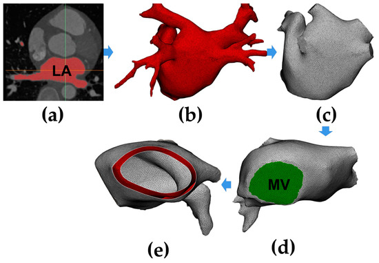Figure 1 shows the process of constructing an anatomy-based LA model. The process was divided into three parts: first, reconstructing the triangular mesh of the LA model with coronary computed tomography angiography (CTA) images (Figure 1a,b), then trimming the four pulmonary veins (PVs) (Figure 1c) and creating the mitral valve (MV) (Figure 1d), and finally, generating the LA model with the atrial wall (Figure 1e).