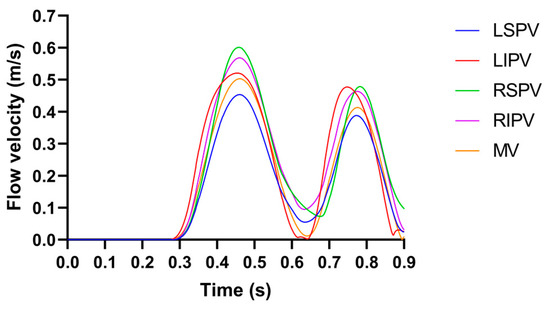 The pulsatile blood flow profiles at the four PVs and MV in the LA model is shown in Figure 2, in which the characteristics of the pulsatile blood flow profiles at the four PVs (peak flow velocity, the ratio of peak flow velocity, and time–velocity integral, etc.) and the mean LA flow velocity are within the range described in the literature [8,14].