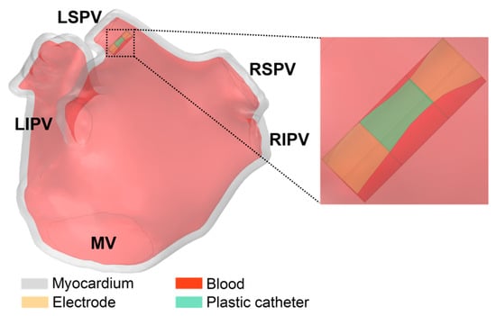 A no-slip condition was applied to the blood–myocardium interface and blood–catheter interface. The four PVs were set as inflows with the condition of 10 mmHg [23], and the MV was set as the outflow with the pulsatile blood flow velocity profile (see Section 2.2).
