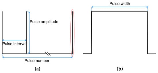 As shown in Figure 4, a typical monophasic PFA waveform usually contains parameters such as pulse width, pulse amplitude, pulse interval, pulse number, etc. The ranges of PFA parameters used in this study were derived from the PFA in AF treatment [20] or animal experiences [21,22], as shown in the following: