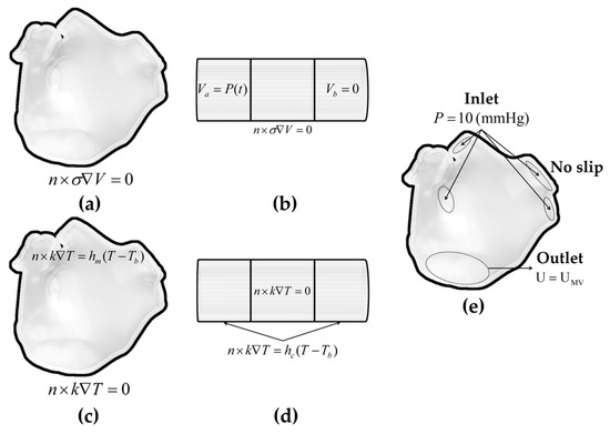 The electrical boundary conditions, thermal boundary conditions, and fluid dynamics boundary conditions of the ablation model. Electrical boundary conditions of (a) the LA model and (b) the catheter model; thermal boundary conditions of (c) the LA model and (d) the catheter model in the CHT method; and fluid dynamics boundary conditions of (e) the LA model in the CFD method.