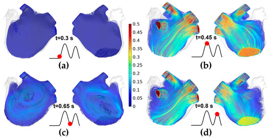 Figure 6 shows the velocity streamlines of pulsatile blood in the ablation model at four moments during a single cardiac cycle. Specifically, at t = 0.3 s, the MV is in the initial state from close to open, and almost no blood flows out of the MV, resulting in the average flow velocity in the LA being minimal ( = 0.005 m/s). At t = 0.45 s, the MV opens and the left ventricle rapidly fills, resulting in the average flow velocity ( = 0.224 m/s) reaching the maximum during a single cardiac cycle; at the moment, part of the blood flow at the LIPV ostium is diverted when it touches the LAA and forms a counterclockwise vortex between LSPV and LIPV. At t = 0.65 s, it is under the diastasis phase, during which no significant blood flow across the MV ( = 0.087 m/s), the blood flow from the four PVs converges in the middle of the LA and forms a clockwise vortex. At t = 0.8 s, the LA contracts, and the velocity characteristic is similar to those at t = 0.45 s, but the average flow velocity ( = 0.076 m/s) is lower than the former.