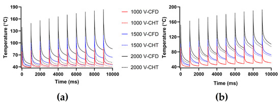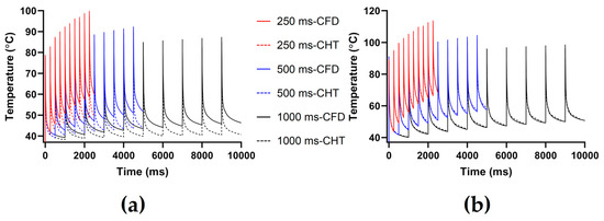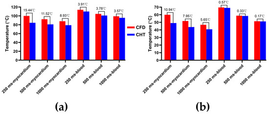 In detail, this study based on obtained and , respectively. Compared with the CFD method, the CHT method based on these two thermal convective coefficients significantly underestimated the differences in the maximum temperature of myocardium but did not significantly underestimate the differences in the maximum temperature of blood except at certain PFA parameters. In contrast, Ana et al. [5] based on obtained and , respectively. Compared with the CFD method, the CHT method based on these two thermal convective coefficients lower than that used in this study can predict the maximum temperature of myocardium well (difference < 3 °C) but drastically overestimates the maximum temperature of blood (difference > 15 °C).