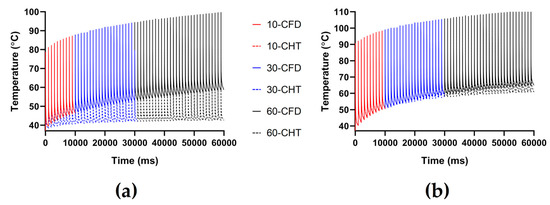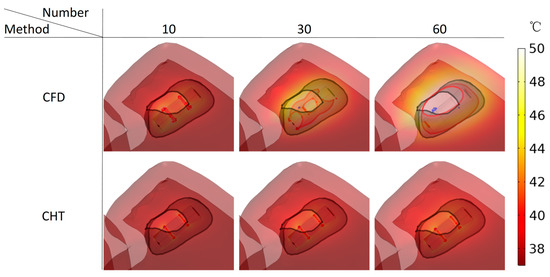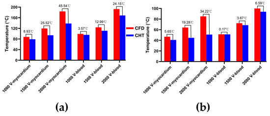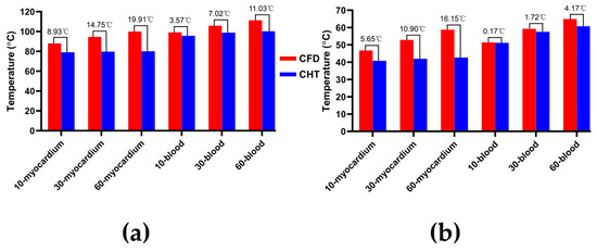 In general, modifying the above two thermal convective coefficients will make the maximum temperature curves of myocardium and blood under the CHT method simultaneously move down (increase thermal convective coefficient) or up (decrease thermal convective coefficient) along the direction of the y-axis representing temperature relative to the maximum temperature curves of myocardium and blood under the CFD method. Therefore, the CHT method based on different thermal convective coefficients seems to accurately simulate only one of the maximum temperatures of myocardium or blood under the CFD method, but the other is consistently underestimated or overestimated.