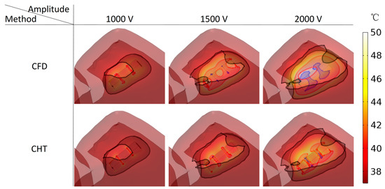Under the pulse amplitude greater than 1000 V, the differences between the CHT method and the CFD method in the temperature ablation volume are significant (>1 mm3), and under the pulse amplitude of 2000 V, the difference between the two methods in the Arrhenius equation ablation volume is significant (>1 mm3).