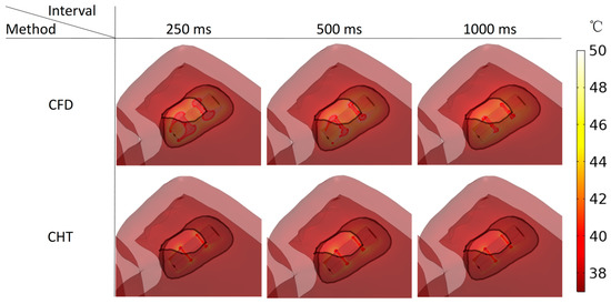 Under the pulse interval of 250 ms, the difference between the CHT method and the CFD method in the temperature ablation volume is significant (>1 mm3).