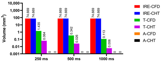 According to Figure 17 and Figure 18, under the different pulse numbers and the CHT method, although there are temperature ablation isosurfaces in the areas where the electrodes are in contact with the plastic catheter, the volumes are all less than 0.1 mm3. Meanwhile, there is no Arrhenius equation ablation isosurface under the CHT method.