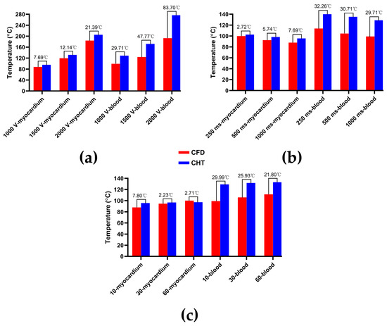 The reason for the above phenomenon is that the thermal convective coefficients in this study and in [5,17] are different. In order to prove this point, this study based on the thermal convective coefficients in [5,17] obtained the statistical results of the maximum temperature curves of myocardium and blood at the end of the last pulse under different PFA parameters. As shown in Figure 19, first, compared with the CFD method, the CHT method overestimated the maximum temperature of blood at the end of the last pulse under different PFA parameters, which is consistent with the results in [5,17]. Second, under the different PFA parameters, the differences in the maximum temperature of the myocardium between the two methods are smaller than the results in Section 3.2 by an average of 60.21% (different pulse amplitudes), 51.18% (different pulse intervals), and 29.62% (different pulse numbers), respectively; in contrast, the differences in the maximum temperature of blood between the two methods are larger than the results in Section 3.2 by an average of 516% (different pulse amplitudes), 823% (different pulse intervals), and 469% (different pulse numbers), respectively, which is also consistent with the results in [5,17], i.e., the differences in the maximum temperature of blood between the two methods are larger than the differences in the maximum temperature of the myocardium.