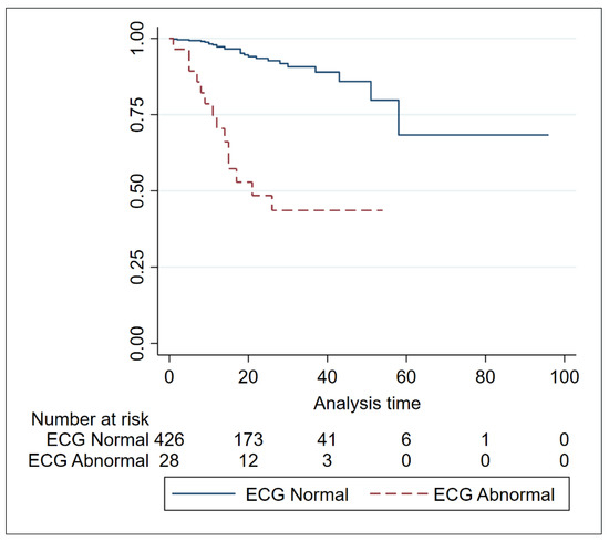 Kaplan–Meier curve of survival freedom among patients with normal and abnormal ECG.