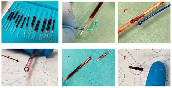 Methodological and practical aspects of the in vitro test. (A) An array of 3 mm internal diameter borosilicate glass tubes filled with blood. (B) Part of the distal tip of the Launcher catheter and test tube. (C) A test tube emptied using a Pronto V4 aspiration catheter with the distal tip obstructed by the clot. (D) Part of the test tube and Vasco 21+D catheter with the distal tip obstructed by a clot. (E) CatchView stentriever removed from a test tube, where the device has only minimal clot debris in the cells. (F) Stentriever completely filled with a clot.