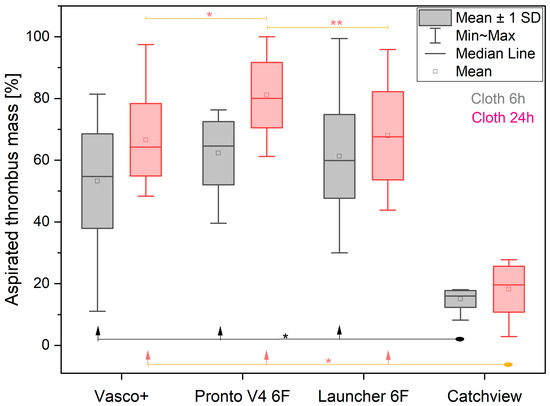 The percentage of the aspirated thrombus mass removed by the different catheters for the 6 h clots (grey) and 24 h clots (red). Significant differences are denoted as * p < 0.001, ** p < 0.01.