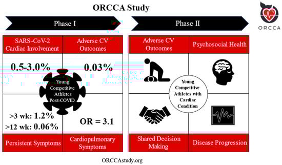 The Outcomes Registry for Cardiac Conditions in Athletes (ORCCA) was established to address these concerns. This prospective study enrolled collegiate athletes from the National Collegiate Athletic Association (NCAA) in the United States with confirmed SARS-CoV-2 infection. The study collected data documenting initial SARS-CoV-2 illness course and severity, cardiac testing results, cardiac and noncardiac diagnoses, and attendant clinical outcomes for athletes returning to organized competitive athletics following infection [15]. Several key practice informing results have been published from this work that included enrollment of 3675 athletes from 45 separate institutions and over one year of published cardiovascular outcomes follow-up (September 2020 to November 2021) (Figure 1) [16].