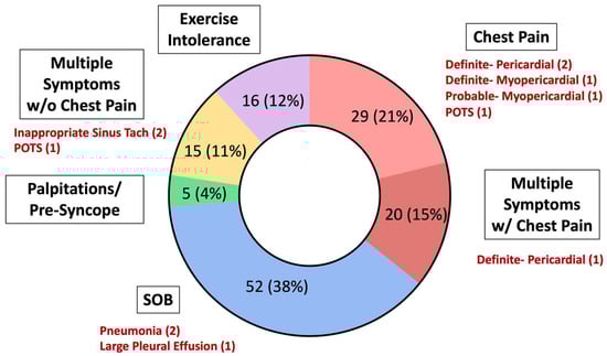 Exertional cardiopulmonary symptoms are defined as the presence of chest pain, shortness of breath, palpitations/tachycardia, presyncope/syncope, or exercise intolerance/fatigue on return to exercise [19]. Exertional cardiopulmonary symptoms were observed in 4.0% of athletes upon return to exercise or sport in the ORCCA study. Clinical evaluation and diagnostic testing led to a diagnosis of SARS-CoV-2 associated sequelae in almost 1 in 10 athletes with exertional cardiopulmonary symptoms. Importantly, this included five athletes with probable or definite SARS-CoV-2 cardiac involvement, and all five athletes experienced chest pain on return to exercise. Other diagnoses included pneumonia, inappropriate sinus tachycardia, postural orthostatic tachycardia syndrome (POTS), and a large pleural effusion. These findings highlight the importance of continued monitoring during the return-to-play period, even in those with asymptomatic or mild acute illnesses, and the need for a comprehensive evaluation in athletes who develop exertional cardiopulmonary symptoms, especially those with chest pain upon return to exercise [18,19].