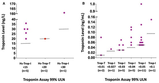 Magnitude of troponin elevation in athletes with abnormal troponin levels. Reproduced from Moulson et al. [32] Open Access, 2022, Journal of American Heart Association. (A) High-sensitivity troponin assays. (B) Traditional troponin assays. Red dots indicate probable or definite SARS-CoV-2 myocardial involvement. Purple dots = athletes with abnormal troponin but no evidence of probable or definite SARS-CoV-2 myocardial involvement; red dots = athletes with abnormal troponin and evidence of probable or definite SARS-CoV-2 myocardial involvement. Hs indicates high sensitivity. Trop: troponin; Trop-I: troponin-I; Trop-T: troponin-T; and ULN: upper limit of normal.