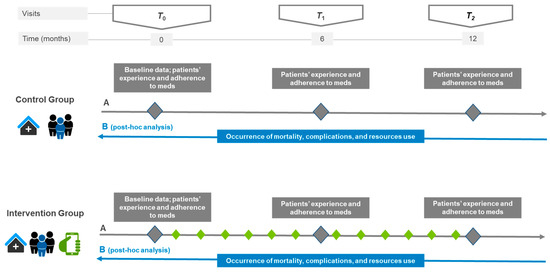 Diagram of the variables collected prospectively during the RCT (A) and retrospectively during the post hoc analysis (B). During the RCT (A), various variables were collected prospectively during the scheduled in-clinic visits: T0 (baseline at study inclusion), T1 (at least 6 months after inclusion), and T2 (at least 12 months after inclusion). The variables assessed during scheduled visits are shown as squares: baseline information, patient experience and medication adherence. For the post hoc analysis (B) the occurrence of mortality, complications, and resource use were collected retrospectively during the study time. Treatments are shown as pictograms, i.e., (i) in-clinic visits at the hospital outpatient department, (ii) multidisciplinary team including the pharmacist, and (iii) the mHeart mobile application for remote interaction with the pharmacist. The diamonds show the scheduled interaction with the clinical pharmacist to perform interventions: gray (during the scheduled in-clinic visits; all patients) and green (using the mHeart tool; intervention group only).