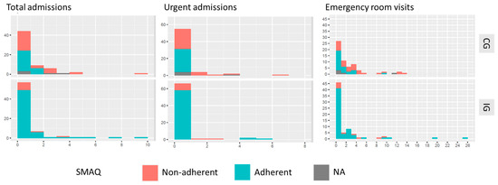 When we assessed the influence of the adherence status on the use of resources according to the study groups (IG or CG), we observed that, among patients in the CG, the adherence status was a factor that significantly decreased both the number of hospitalizations and emergency room visits. However, the impact of the adherence status on the use of resources was not observed in the IG (Figure 2).