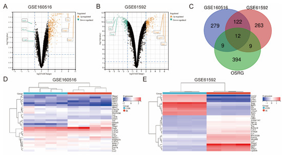 Identification of DEGs and differentially expressed OSRGs in myocardial ischemia–reperfusion injury. (A) The volcano plot of GSE160516. (B) The volcano plot of GSE61592. For (A,B), the blue dots in the upper-left box are downregulated genes, the orange-yellow dots in the upper-right box are upregulated genes, and the black dots represent genes that are not significantly different. (C) Venn diagram of DEGs in GSE160516, GSE61592, and OSRGs in MSigDB. (D) Heatmap of the top 30 DEGs in GSE160516. (E) Heatmap of the top 30 DEGs in GSE61592.