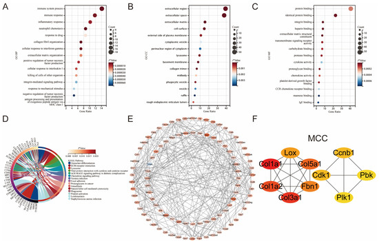 Enrichment analysis and PPI analysis of CoDEGs in GSE160516 and GSE61592. (A) Bubble plot of the top 15 biological processes. (B) Bubble plot of the top 15 cellular components. (C) Bubble plot of the top 15 molecular functions. (D) Circle plot of the top 15 KEGG pathway enrichment analysis. (E) The whole PPI Network of CoDEGs. The shade of the color represents the magnitude of the relative change multiple in GSE160516. (F) Prediction results of the MCC algorithm. A darker color denotes a higher score on this algorithm.