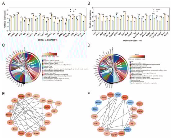 Expression pattern of OSRGs in cardiac ischemia-reperfusion injury. (A) Expression pattern of OSRGs in GSE160516. (B) Expression pattern of OSRGs in GSE61592. (C) Circle plot of Go BP analysis for OSRGs in GSE160516. (D) Circle plot of Go BP analysis for OSRGs in GSE61592. (E) PPI network of OSRGs in GSE160516. (F) PPI network of OSRGs in GSE61592. For panels (A,B), ** p < 0.01, *** p < 0.001.