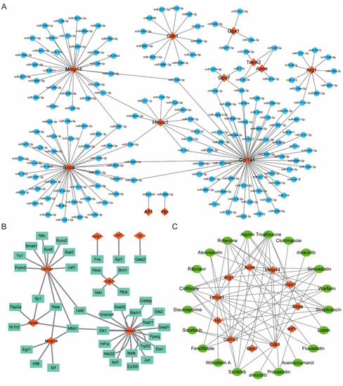 Prediction of OSRG-related miRNAs, transcription factors, and therapeutic drugs. (A) The miRNA–mRNA regulatory network. (B) The TF–mRNA regulatory network. (C) The drug–mRNA regulatory network. For panels (A–C), orange-red diamond patterns represent OSRGs; blue circular patterns represent miRNAs; cyan rectangular patterns represent transcription factors; green oval patterns represent the therapeutic drug.