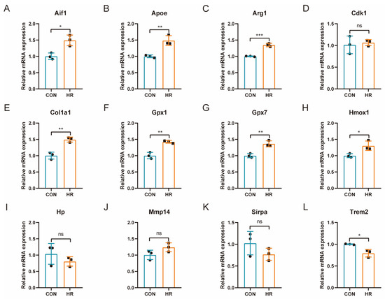 qRT-PCR Verification of common differentially expressed OSRGs in H9C2 cell hypoxia–reoxygenation model. For panels (A–L), ns denotes no statistical difference; * p < 0.05, ** p < 0.01, *** p < 0.001.